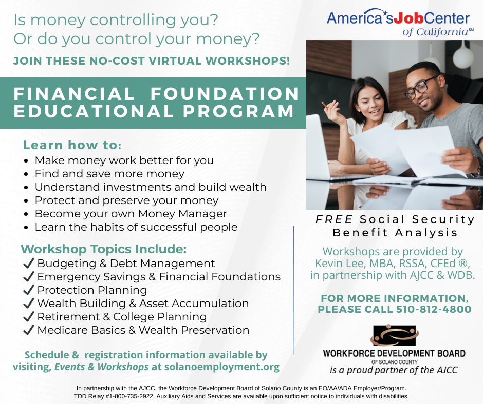 Are you ready to stop stressing about money and start building a future you’re proud of? The Financial Foundation Educational Program is offering six powerful, no-cost virtual workshops designed to help you take charge of your financial future—step by step.