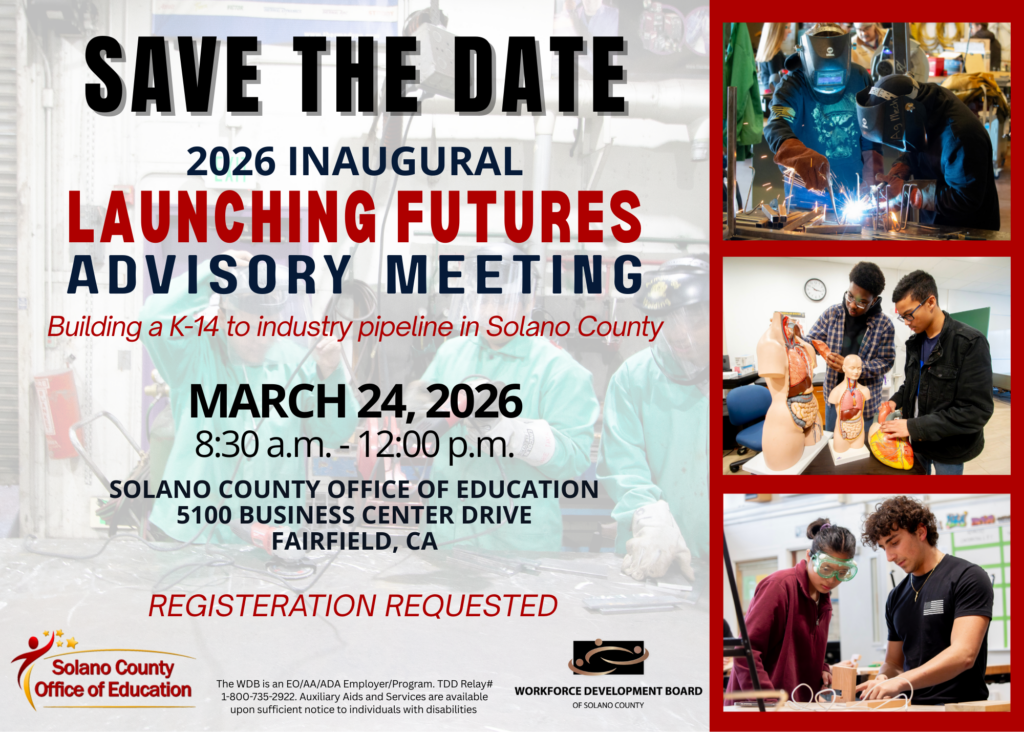 Launching Futures is a collaborative initiative led by the Solano County Office of Education in partnership with the Workforce Development Board of Solano County. Together, these partners are aligning education, industry, and workforce efforts to strengthen Career Technical Education pathways across Solano County.