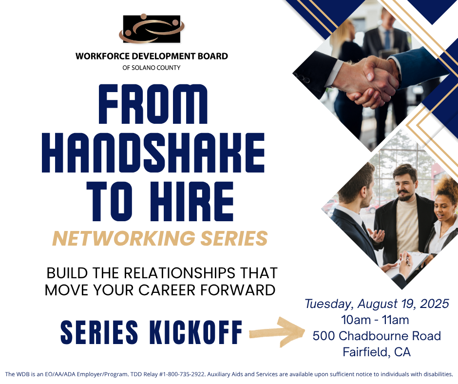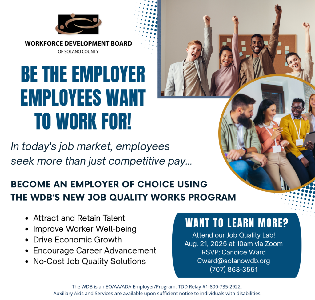 In these post-pandemic times, the WDB and AJCC continue to work hard to offer services to our business and working community both in-person and virtually for your safety and convenience. We are happy to be a part of the recovery and growth of Solano County’s workforce and hope our workshops and programs will help you during your journey.